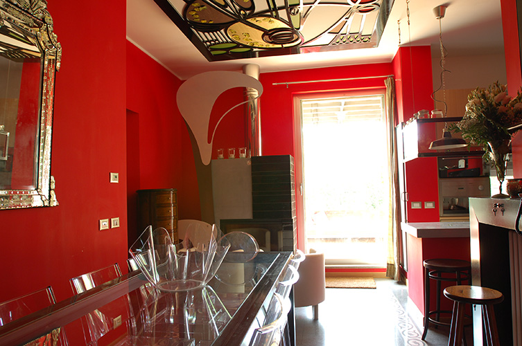 Nel soggiorno, ambiente che più degli altri svela la voluta rilettura in chiave attuale contemporanea dello stile tradizionale italiano, principio che ha inspirato tutto l’arredamento, spiccano tra pezzi di antiquariato e complementi d’arredo tipicamente moderni, il pannello luminoso in stile liberty e il camino rivestito in maioliche nere.